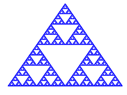 We can use this theorem to compute the Hausdorff dimension of the Sierpinski triangle (or sometimes called Sierpinski gasket). Consider three non-collinear points a1, a2, a3 in the plane R2 and let ψi be the dilation of ratio 1/2 around ai. The unique non-empty fixed point of the corresponding mapping ψ is a Sierpinski gasket and the dimension s is the unique solution of