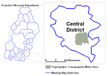Tegucigalpa is located in the southern-central highland region known as the department of Francisco Morazán of which it is also the departmental capital.[16] It is situated in a valley, surrounded by mountains. Tegucigalpa and Comayagüela, being sister cities, are physically separated by the Choluteca River.[17] The Central District is the largest of the 28 municipalities in the Francisco Morazán department.[18]