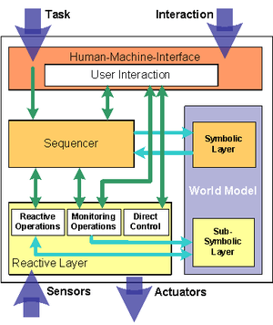 With respect to a semi-autonomous service robotic system this means that the user's cognitive capabilities are taken into account, whenever a robust and reliable technical solution is unavailable. It is obvious that the acceptance of such a system will be low in general. But for people that are dependent on a personnel assistant, like the disabled or elderly, this approach offers the opportunity to decrease this dependency and therefore to increase their quality of life. A service robot has to be able to pursue a certain mission goal as commanded from its user but also needs to react flexibly to dynamic changes within the workspace. To meet these requirements, hybrid multi-layer control architectures have been successfully applied.[5][6] These architectures usually consist of three layers: