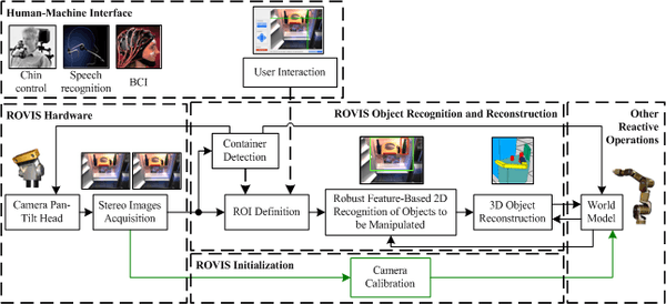 In order to cope with the above described problems in the care-providing robot FRIEND the special vision system ROVIS (RObust machine VIsion for Service robotics) [13][14] was developed. The structure of ROVIS is depicted in Fig. 5. There are two main ROVIS components: hardware and object recognition and reconstruction chain. The connection between ROVIS and the overall robot control system is represented by the World Model where ROVIS stores the processed visual information. At the initialization phase of ROVIS the extrinsic camera parameters needed for 3D object reconstruction and the transformation between stereo camera and manipulator which is necessary for vision based object manipulation are calculated by the Camera Calibration module. The object recognition and reconstruction chain consists of robust algorithms for object recognition and 3D reconstruction for the purpose of reliable manipulation motion planning and grasping in unstructured environments and variable illumination conditions. Therefore, an accuracy of 5mm for the estimated 3D pose is necessary which enforces very good and precise algorithms. In ROVIS, robustness must be understood as the capability to the system to adapt to varying operational conditions and is realized through the inclusion feedback mechanisms at the image processing level and also between different hardware and software components of the vision system.[15] A core part of the system is the automatic, closed-loop calculation of an image Region of Interest (ROI) on which vision methods are applied. By using a ROI the performance of object recognition and 3D reconstruction can be improved since the scene complexity is reduced.
