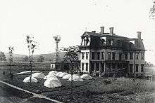 In 1889 Myers purchased the Gates Mansion Victorian style house with five acres of property that was located near Frankfort, New York, previously owned by Fred Gates of the Diamond Match Company. Here Myers and his wife went into the business of manufacturing passenger balloons and specialty purpose gas balloons, many for the US government. The balloons that had just been assembled were partially inflated outdoors to test if they held the hydrogen gas properly. Because of the large balloons half inflated and laid out on the property grounds, it gave the impression they were growing large mushrooms or some unusual new farm crop. In time people figured out they were really making balloons and it became known as the Frankfort "balloon farm."[7][8]