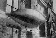 The envelope that held the hydrogen gas of Myers' torpedo airship was made of red and yellow silk. One of its trips was a distance of 600 miles and it ran at an average speed of 12 miles an hour. It was powered forward by a propeller that spun at 5,000 revolutions per minute. The caloric engine that drove the propeller was a spontaneous combustion engine "fed" with nitroglycerin semi-translucent fuel pellets. This type of airship could hold up to 10 passengers or a combination of freight and crewmen.[24] Myers' "torpedo" airships were built later in larger versions. Some were entered in airship contests and one was demonstrated at the St. Louis World's Fair of 1904. It was 74 feet long and 21 feet in diameter. It contained 14,000 cubic feet of hydrogen gas and would lift 900 pounds of weight. Myers made several successful experimental test flights at his Frankfort "balloon farm" before delivering it to a Mr. Benbow, the purchaser. After that it was referred to as the Benbow airship. The airship had four 10 horse-power gasoline motors that ran propellers of 4 blades each. The four propellers could be manipulated in most any direction so the operator could steer the airship sideways right and left, go up and down, and forward and backwards as desired.[25]