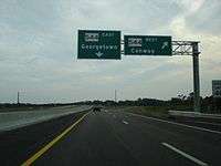 The contract was signed on March 10, 2000 with a completion date of July 24, 2003.[21] Most of the construction work was completed by November 2002. Although the road was meant to open in July of that year, delays came when constructing the overpass at Water Tower Road, requiring the dirt road to be relocated to the overpass. The interchange with Robert Grissom Parkway was to be opened as a partial interchange, with further study to be done on converting it into a full interchange with International Drive to connect to Carolina Forest.[22] Before the official opening, many were using the road as an unofficial bypass around the highways in Myrtle Beach and as a faster route to deliver and remove materials for subdivisions in Carolina Forest.[23] The first phase opened on December 17, 2002.[24]