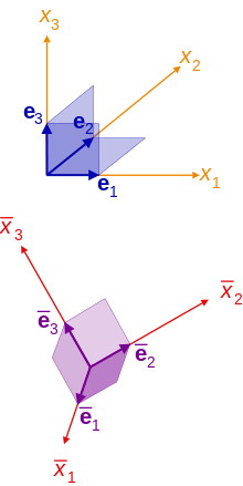 In another rectangular coordinate system, x as a contravector has coordinates xi and bases ei, while as a covector it has coordinates xi and bases ei, and we have: