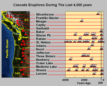 Eleven of the 13 volcanoes in the Cascade Range have erupted at least once in the past 4,000 years, and seven have done so in just the past 200 years.[13] The Cascade volcanoes have had more than 100 eruptions over the past few thousand years, many of them explosive eruptions.[13] However, certain Cascade volcanoes can be dormant for hundreds or thousands of years between eruptions, and therefore the great risk caused by volcanic activity in the regions is not always readily apparent.