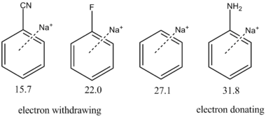The electronic properties of the substituents also influence the strength of the attraction.[11] Electron withdrawing groups (for example, cyano −CN) weaken the interaction, while electron donating substituents (for example, amino −NH2) strengthen the cation–π binding. This relationship is illustrated quantitatively in the margin for several substituents.