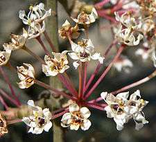 The inflorescences are borne on short stalks less than three centimeters long and are small and rounded with tiny white flowers.[1] They can be quite dense and can cover branches thickly, or they may be sparse. The flowers are white, though may have a yellowish or pink tint.