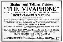 By 1910, Hepworth was also the inventor of Vivaphone, an early sound on disk system for adding sound to motion pictures. The device used phonograph records to record and play back the sound. Hepworth's vivaphone was distributed in Britain and also in the United States and Canada.[2][3]