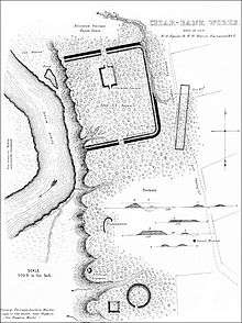 The site was surveyed in 1845 by Ephraim George Squier and Edwin Hamilton Davis. They reported about their survey in their 1848 publication, Ancient Monuments of the Mississippi Valley. They describe the site as consisting of a "wall and an outer ditch, which constitute three sides of a parallelogram. The fourth side is protected by a natural bank or bluff, 70 feet high, and so steep as to admit of no ascent, except at one point where it has been gullied by the flow of water."[3]