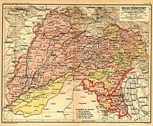 The Ceded and Conquered Provinces constituted a region in northern India that was ruled by the British East India Company from 1805 to 1834;[1] it corresponded approximately—in present-day India—to all regions in Uttar Pradesh state with the exception of the Lucknow and Faizabad divisions of Awadh; in addition, it included the Delhi territory and, after 1816, the Kumaun division and a large part[2] of the Garhwal division of present-day Uttarakhand state.[1] In 1836, the region became the North-Western Provinces (under a Lieutenant-Governor), and in 1904, the Agra Province within the United Provinces of Agra and Oudh.[1]