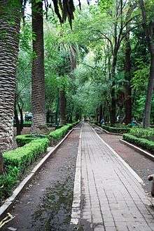 The original complex covered an area of 250,000m2. However, construction surface at the ground level only covered 16,000, leaving 80% of the grounds free for parks and sports areas.[5] It contained nineteen buildings of various heights, between three and nineteen floors. These buildings contained a total of 984 apartments of twelve different types to accommodate between 3,000 and 5,000 people.[5][8] The buildings had four types, labeled "A" (largest) "B", "C" and "D", with total apartment floor space of 700,000sq ft.[8] At the Alemán complex, the buildings zigzag over the site, but in the Juarez complex, the buildings are placed at angles to give a greater sense of privacy and to give as much natural light as possible for the apartments.[5][9] There are no vehicular roads within the complex to allow pedestrians to walk around. All of the vehicular roads that enter terminate at a parking lot before one enters where the apartment buildings are.[5] There is only one road that passes through the complex, Orizaba Street, but this road was lowered below ground level, the first time this was done in Mexico City.[1][5] Pani placed four of the "C" type buildings right alongside this underpass to free even more space between the buildings for park and recreational space. About 2,500 trees were planted at the site.[10] These emphasis on space reduced Le Corbusier's recommendation of 1,000 residents per hectare to 240, and would make this the least densely populated of his apartment projects.[11] The apartments were split into two levels, with the kitchen and living room on one floor and the bedrooms above or below. In this way, elevators only had to stop at every third floor. All apartment and elevator access was through open passages. Within the apartments, open space was created by eliminating walls between the living and dining rooms, which was popular in the United States starting in the 1950s and 1960s. Tenants disposed of garbage though chutes to the basement, a novel idea in Mexico at that time.[12]