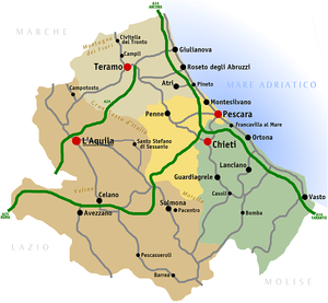 Montepulciano is produced in all four provinces of Abruzzo--L'Aquila, Chieti, Pescara and Teramo—with the southern fertile province of Chieti producing the largest total quantity of wine. The mountainous province of L'Aquila is noted mainly for the dry rosé labeled as Cerasuolo produced in the DOC. The most favorable vineyards are planted in the northern provinces of Pescara and Teramo with the later having its own DOCG designation above Montepulciano d'Abruzzo.[6] These northern provinces benefit from having less fertile soils with more ferrous clay and limestone mix and higher elevations as the Apennines draw closer to the Adriatic. This creates cooler micro-climates that tend to produce more concentrated wines.[4]