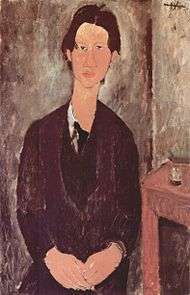 For a time, he and his friends lived at La Ruche, a residence for struggling artists in Montparnasse where he became friends with Amedeo Modigliani (1884–1920). Modigliani painted Soutine's portrait several times, most famously in 1917, on a door of an apartment belonging to Léopold Zborowski (1889–1932), who was their art dealer.[3] Zborowski supported Soutine through World War I, taking the struggling artist with him to Nice to escape the German invasion of Paris.