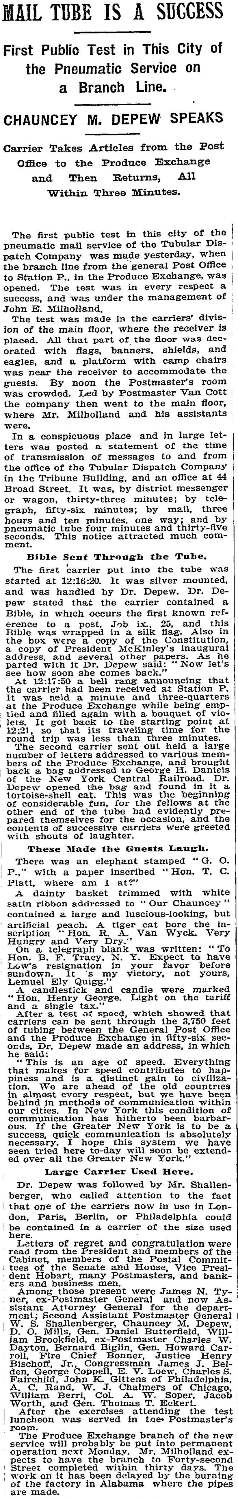 - ↑ "Mail Tube is a Success". New York Times. 8 October 1897.