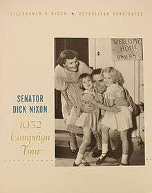By this time, Nixon campaign headquarters was receiving a flood of messages, calling on the senator to resign from the ticket.[23] When Eisenhower's train stopped for the candidate to make speeches, he faced protesters with signs reading "Donate Here to Help Poor Richard Nixon".[24] The influential Washington Post and New York Herald-Tribune both called for Nixon to leave the ticket, facts which Chotiner did not tell his candidate; Nixon learned them from a questioning reporter. Over 100 newspapers would editorialize about the Fund on the morning of September 20, opinion running two to one against Nixon.[25] As his train stopped in Eugene, Oregon, Nixon was met with protestors signs referencing his wife: "Pat, What Are You Going to Do With the Bribe Money?" and "No Mink Coats for Nixon—Just Cold Cash". He angrily responded with a phrase which would be echoed in the Checkers speech. After stating that there were no mink coats for the Nixons, the candidate said that he was "proud of the fact that Pat Nixon wears a good Republican cloth coat, and she's going to continue to."[24]