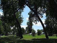 Snowfall is greatest in March and April, seasonally averaging 60 inches or 1.52 metres, historically ranging from 13.1 inches (0.33 m) between July 1965 and June 1966 up to 121.5 inches (3.09 m) between July 1979 and June 1980, yet thick snow cover rarely stays.[14] Summers are warm, with a high diurnal temperature range; July averages 69.4 °F or 20.8 °C, and highs reach 90 °F or 32.2 °C on an average twelve afternoons annually. Spring and autumn are quick transitions, with the average window for freezing temperatures being September 29 thru May 14, allowing a growing season of 106 days.[13] Official record temperatures range from −38 °F (−38.9 °C) on January 9, 1875, up to 100 °F (37.8 °C) on June 23, 1954, the last of four occurrences; the record cold daily maximum is −21 °F (−29.4 °C) on January 11, 1963, while, conversely, the record warm daily minimum is 68 °F (20 °C) on July 31, 1960.[13] The annual precipitation of 15.9 inches or 403.9 millimetres tends to be concentrated from May to August and is low during fall and winter; it has historically ranged from 5.04 inches (128.0 mm) in 1876 to 23.69 inches (601.7 mm) in 1942.[13]