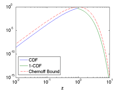 Letting , Chernoff bounds on the lower and upper tails of the CDF may be obtained.[9] For the cases when (which include all of the cases when this CDF is less than half):