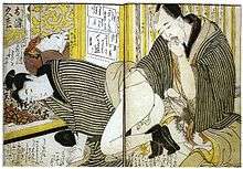 As Japanese society became pacified, the middle classes adopted many of the practices of the warrior class, in the case of shudō giving it a more mercantile interpretation. Male prostitutes (kagema), who were often passed off as apprentice kabuki actors and who catered to a mixed male and female clientele, did a healthy trade into the mid-19th century despite increasing restrictions.[15][16] Many such prostitutes, as well as many young kabuki actors, were indentured servants sold as children to the brothel or theatre, typically on a ten-year contract.[17][18] Relations between merchants and boys hired as shop staff or housekeepers were common enough, at least in the popular imagination, to be the subject of erotic stories and popular jokes.[19] Young kabuki actors often worked as prostitutes off-stage, and were celebrated in much the same way as modern media stars are today, being much sought after by wealthy patrons, who would vie with each other to purchase their favors.[20] onnagata (female-role) and wakashū-gata (adolescent boy-role) actors in particular were the subject of much appreciation by both male and female patrons,[21] and figured largely in nanshoku shunga prints and other works celebrating nanshoku, which occasionally attained best-seller status.[22]