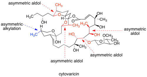 Chiral auxiliaries are incorporated into synthetic routes to control the absolute configuration of stereogenic centers. David Evans' synthesis of cytovaricin, considered a classic, utilizes oxazolidinone chiral auixiliaries for one asymmetric alkylation reaction and four asymmetric aldol reactions, setting the absolute stereochemistry of nine stereocenters.[6]