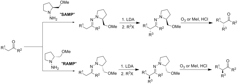 Alkylation reactions of chiral (S)-1-amino-2-methoxymethylpyrrolidine (SAMP) and (R)-1-amino-2-methoxymethylpyrrolidine (RAMP) hydrazones were developed by Dieter Enders and E.J. Corey.[30][31]