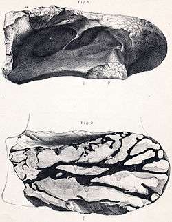 The type species, Chondrosteosaurus gigas, was described and named by Richard Owen in 1876. The fossils of Chondrosteosaurus were discovered in the Wessex Formation on the Isle of Wight. C. gigas is known only from two neck vertebrae (specimens BMNH 46869, the holotype, and BMNH 46870), with distinctive hollows and internal passages now interpreted as evidence of pneumatic air sacs. Paleontologist Harry Seeley had interpreted similar structures as pneumatic in his specimen of Ornithopsis.[1] Owen disagreed with Seeley's concept of a giant creature bridging the gap between birds or pterosaurs (Owen considered sauropods to be whale-like marine reptiles), and while he acknowledged that the external cavities on the vertebrae may have been connected to the lungs, he interpreted the internal passages as having been filled with cartilage (hence his name for the genus, Chondrosteosaurus or "cartilage and bone lizard").[2]