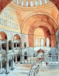In a laudatory 76-line epigram inscribed on the walls of the church and preserved in its entirety (Anthologia Graeca, I.10), Juliana compares herself to past emperors Constantine I and Theodosius II as a monumental builder, and claims to have surpassed Solomon's Temple, on whose proportions the new church was allegedly based. The building constituted thereby a direct challenge to the prestige and authority of the low-born reigning dynasty, and it may have been one of the reasons for the massive scale of Justinian's reconstruction of the Hagia Sophia a few years later.[4] In light of this rivalry, it is perhaps no coincidence that Justinian too, when he beheld the completed Hagia Sophia, is said to have cried out: "Solomon, I have surpassed thee."[5] The importance of the Solomonic allusions is however questioned by some scholars, who see the church more as a statement of the imperial prestige of the Old Roman aristocracy, from which Juliana descended, and of Chalcedonian orthodoxy, which she had championed during the reign of the Monophysite emperor Anastasius I (r. 491–518).[6] A further aspect of the antagonism with Justinian however is evidenced by a tale recorded by Gregory of Tours: shortly after his accession, Justinian called upon the aged Juliana to contribute a part of her large fortune to the state treasury. After stalling for time, she had her gold melted down and fashioned into plates, with which she adorned the interior of the roof of the newly built church of St. Polyeuctus, thus preserving it from the emperor's avarice.[7]