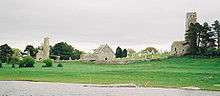 He was a student of Finian's at Clonard and in time became a teacher, himself.[3] Columba of Iona said of Ciarán, “He was a lamp, blazing with the light of wisdom.”[8] In about 534, he left Clonard for Inishmore where he studied under Enda of Aran, who ordained him a priest and advised him to build a church and monastery in the middle of Ireland.[3] Later, he travelled to Senan on Scattery Island (in about 541). In 544, he finally settled in Clonmacnoise, where he founded the Monastery of Clonmacnoise with ten fellow companions.[9] As abbot, he worked on the first buildings of the monastery; however, he died about seven months later of a plague, in his early thirties.[3] His feast day is 9 September.[3]
