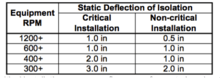Circle-throw vibrating units rely on operating the screen component at a resonant frequency to sieve efficiently. While properly selected vibration frequencies drastically improve filtration, a deflection factor occurs as the vibrations displaces smaller particles. They do not properly pass through the screen due to excess movement. This is a property of the system's natural frequency. The natural frequency preferably vibrates at Fn is 188(1/d)2 (cycles per min) where d = (188/Fn)2 (inches). Static deflection corresponds to this frequency. Vibration isolation is a control principle employed to mitigate transmission. On circle-throw vibrating screens, passive vibration isolation in the form of mechanical springs and suspension are employed at the base of the unit, which provides stability and control of motor vibration. A rule of thumb regarding the amount of static deflection minimization that should be targeted with respect to operating RPM is provided in the table below.[10]