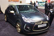The DS 3 is a supermini, produced by the French manufacturer Citroën since 2009 and officially launched in January 2010.[1] This was the first car in the new DS range from Citroën (pronounced déesse, which is French for goddess). Its design was inspired by the concept car Citroën DS Inside.[2] The DS3 range was facelifted in 2016, and re-launched without Citroën badges.