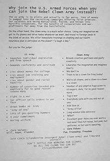 - ↑ http://beautifultrouble.org/case/clandestine-insurgent-rebel-clown-army/