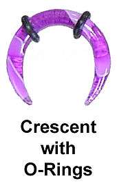 The claw, talon or pincher is essentially a curved taper which is worn in stretched ear lobe piercings. The thickest end is generally flared and may be decorated, and a rubber o-ring may also be used to prevent the talon from becoming dislodged when worn. Common materials include acrylic and glass. A similar item of jewelry is the crescent, or pincher, which as the name suggests, is shaped like a crescent moon and is tapered at both ends. Talons and claws may also be quite ornamental (e.g.: carved in the form of a serpent or dragon). Consequently, they may prove to be an impractical choice of jewelry as they may snag on hair, clothing, etc.