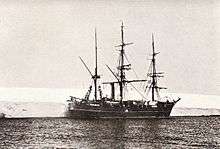 Markham had, through his various activities, come to know many influential people, and during the early 1870s used these connections to make the case for a Royal Naval Arctic expedition. Prime minister Benjamin Disraeli consented, in the "spirit of maritime enterprise that has ever distinguished the English people".[49] When the expedition was ready to sail, Markham was invited to accompany it as far as Greenland, on HMS Alert, one of the expedition's three ships. Markham accepted, and left with the convoy on 29 March 1875. He was gone for three months, remaining with Alert as far as the island of Disco in Baffin Bay. He wrote of this journey: "I never had a happier cruise ... a nobler set of fellows never sailed together."[50] He returned to England on the support vessel HMS Valorous,[51] although the homeward voyage was delayed after Valorous struck a reef and required substantial repairs.[52] Markham's extended absence from his India Office duties, together with his increasing involvement in a range of other interests, caused his superiors to request his resignation. Markham retired from his post in 1877, his 22 years of service entitling him to a pension.[4]