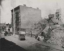 A lone surviving structure that dates from the time this area was open farmland and suburban villas is a pre-1800s carriage house that once belonged to a villa owned by former Vice President and New York State governor George Clinton, now in a narrow court behind 422 West 46th Street.[14] From 1811 until it was officially de-mapped in 1857, the diminutive Bloomingdale Square was part of the city's intended future; it extended from 53rd to 57th Streets between Eighth and Ninth Avenues. It was eliminated after the establishment of Central Park,[15] and the name shifted to the junction of Broadway, West End Avenue, and 106th Street, now Straus Park. In 1825, the City purchased for $10 clear title to a right-of-way through John Leake Norton's[lower-alpha 1] farm, "The Hermitage", to lay out 42nd Street clear to the river. Before long, cattle ferried from Weehawken were being driven along the unpaved route to slaughterhouses on the East Side.[16] Seventy acres of the Leakes' (later the Nortons') property, extending north from 42nd to 46th Street and from Broadway to the river, had been purchased before 1807 by John Jacob Astor and William Cutting, who held it before dividing it into building lots as the district became more suburban.