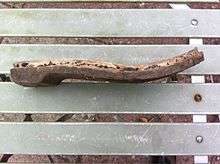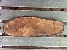 The traditional method of construction starts with gangs of itinerant woodsmen who would buy a stand of timber for the felling.[8] The regular gangs would operate in a similar fashion to coppice workers and circulate around 12 stands in 12 years to allow regrowth.[9] The timber was felled and sawn to length. Logs from larger trees were split; that from smaller coppice wood did not require splitting.[10] The billets were roughly shaped with a stock knife and a deep notch put in where the sole and heel meet.[lower-alpha 2] All the work was done in green wood which is easier to work than seasoned wood.[10] The clog blocks were then generally stacked up in open pyramids to allow the air to circulate and seasoned for a few months.[10] The offcuts and waste was sold on, either as pea-sticks and firewood to provide money for food or else as fuel to the wool dyeing trade.[8][10]
