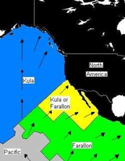 One of the major events during the Coast Range Arc was about 85 million years ago when a huge rift developed near the center of the oceanic Farallon Plate. This rifting event created the oceanic Kula Plate.[2] It is unknown why such a large rupture of the Farallon Plate occurred.[2] Some geologists believe some fundamental change in convection within the Earth's mantle caused the rifting event, while others believe the huge oceanic plate became mechanically unstable as it continued to subduct beneath the Pacific Northwest.[2] The Kula Plate once again continued to subduct beneath the continental margin, supporting the Coast Range Arc.[2]