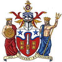Arms: Gules a cannon barrel erect palewise proper surmounted by a lion's face or between two hour glasses or a chief nebuly of one point upwards azure thereon a chief nebuly of one point uppwards argent charged with two mullets azure. Crest: Upon a helm with a wreath argent and azure on waves barry wavy of four argent and azure a foul anchor or charged with a Tudor rose barbed and seeded proper; mantled gules lined or. Supporters: On the dexter a representation of Zeus proper vested gules murally crowned and holding in the dexter hand a Hartmann astrolabe or and on the sinister a representation of Neptune proper vested azure crowned with a naval crown & holding in the sinister hand a trident or.
