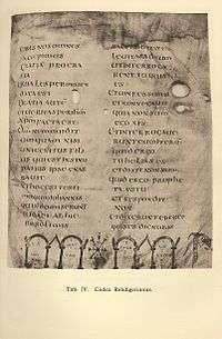 Codex Rehdigerianus designated by l or by 11 (in Besauron numbering), is a medieval Latin manuscript written on parchment, which was held in the city library of Breslau.[1] The manuscript is attributed to Cassiodorus II of St. Elisabeth's Church, Breslau.[2] The Codex was named after Thomas Rehdiger, an antiquary from Śląsko, who was the patron of Vulcanius.The manuscript was edited and published in 1913. Dated palaeographically to the 7th or 8th century.[3]