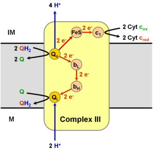 In the process called Q cycle,[6][7] two protons are consumed from the matrix (M), four protons are released into the inter membrane space (IM) and two electrons are passed to cytochrome c.