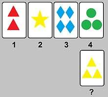 In the Dimensional Change Card Sorting Task (DCCS), children are initially asked to sort cards by a single dimension (such as color), and are subsequently required to alter their strategy to sort cards based on a second dimension (such as shape).[18] Typically, three-year-old children are able to sort cards based on a single dimension, but are unable to switch to sort the cards based on a second dimension. However, five-year-old children are able to sort cards based on one dimension and can then switch to sorting cards on a second dimension.[17][19]