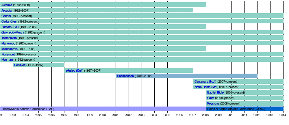 ^ - Former women's college now-turned co-ed college (Immaculata since 2005-06; Rosemont since 2009-10)