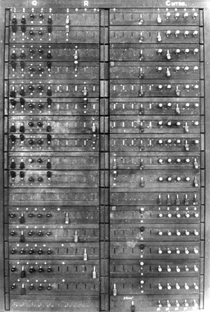 After performing various resetting and zeroizing tasks, the Wren operator would set the twelve wheel patterns that had been determined by the wheel breaking process and the start positions for the current run. Then, under instruction from the cryptanalyst, she would operate the “set total” decade switches and the switches and plugs to achieve the desired algorithm. She would then start the bedstead tape motor and lamp, and when the tape was up to speed operate the master start switch.[52]