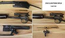 The Colt Lightning Carbine or Colt Lightning Rifle was a slide-action (pump-action) rifle manufactured by Colt from 1884 to 1904 and was originally chambered in .44-40 caliber.[1][2] Colt eventually made the Lightning Rifle in three different frame sizes, to accommodate a wide range of cartridges, from .22 Short caliber and .38-40 to .50-95 Express.[3] Its profile somewhat resembles the pump-action rimfire rifles made by the Winchester Repeating Arms Company and Remington Arms.[2] The Lightning saw use as a sporting arm in America and was adopted for use by the San Francisco Police Department, but was never as popular or as reliable as the various lever-action rifles of its day.[2]