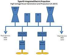 A system which uses both diesel engines and gas turbines to generate electricity for electric motors, where there is no mechanical transmission from either to the propellers, is not classified as CODLAG, but as integrated electric propulsion (IEP) or integrated full electric propulsion (IFEP). Such an arrangement is in use on passenger ships like RMS Queen Mary 2, with a pool of diesel generators for the base load and turbo generators for peak power, and on warships such as the Royal Navy's Type 45 destroyer and the upcoming Zumwalt-class destroyer (DDG-1000/DD(X)).