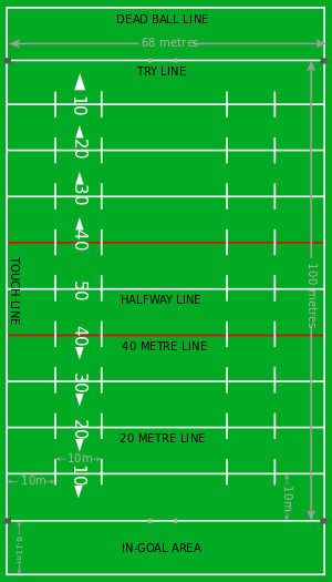 A rugby league field is similar, it may be 112-122 by 68 metres[2] (122.5-133.4 × 74.3 yards). The longer boundary lines are touch lines, while the shorter boundary lines are dead ball lines.[2] The touch lines and dead ball lines are out of play.[3] Near each end of the field is a goal line,[2] or try-line; they are 100 metres (109.4 yards) apart.[2] A scoring area equivalent to an end-zone called the in-goal area extends 6–11 metres (6.6-12 yards) from each try-line to each dead ball line, the ball may be grounded to score a try here.[2] On the goal line are a set of goal posts in the shape of the letter 'H', used for other forms of point scoring: drop goal, penalty goal and conversion.