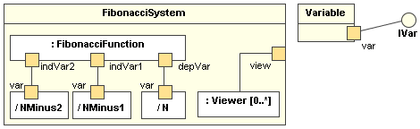 - Port : A port is an interaction point that can be used to connect structured classifiers with their parts and with the environment. Ports can optionally specify the services they provide and the services they require from other parts of the system. In the diagram, each of the small squares is a port. Each port has a type and is labelled with a name, such as "var", "indVar1", or "view" in the diagram. Ports may contain a multiplicity factor, for example [3].