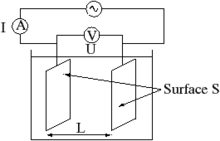 The electrical conductivity of a solution of an electrolyte is measured by determining the resistance of the solution between two flat or cylindrical electrodes separated by a fixed distance.[3] An alternating voltage is used in order to avoid electrolysis. The resistance is measured by a conductivity meter. Typical frequencies used are in the range 1–3 kHz. The dependence on the frequency is usually small,[4] but may become appreciable at very high frequencies, an effect known as the Debye–Falkenhagen effect.