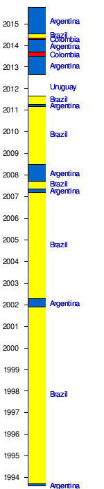 | Combined CONMEBOL Appearances | 7 | 2 | 1 | 5 | 2 | 3 | 5 | 4 | 3 | 4 | 3 | 4 | 4 | 4 | 4 | 5 | 5 | 4 | 5 | 6 | TBD | TBD | 80 | |