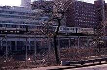 The Garfield Park elevated was replaced by the Congress line on June 22, 1958,[9] pioneering the world's first use of rail rapid transit and a multi-lane automobile expressway in the same grade-separated right-of-way.[10] (Pacific Electric Railway "Red Car" tracks ran in the median of the Cahuenga Parkway in Los Angeles from 1944 until its expansion into the Hollywood Freeway in 1952, but the Pacific Electric service was an interurban streetcar rather than true rapid transit.) The new line connected with the Milwaukee-Dearborn Subway at the Chicago River and extended westward to Des Plaines Avenue in Forest Park. Loomis Ramp, built at this same time, permitted Douglas trains to operate through the subway as well combining the Logan Square, Garfield Park (now Congress) and Douglas routes into the second through service in Chicago, the West-Northwest route.[11]