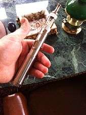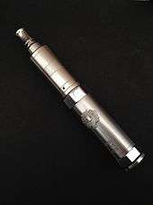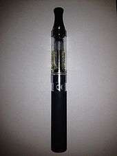 An electronic cigarette is a battery-powered vaporizer.[1] The primary parts that make up an e-cigarette are a mouthpiece, a cartridge (tank), a heating element/atomizer, a microprocessor, a battery, and possibly a LED light on the end.[2] An atomizer comprises a small heating element that vaporizes e-liquid and wicking material that draws liquid onto the coil.[3] When the user pushes a button,[4] or (in some variations) activates a pressure sensor by inhaling, the heating element then atomizes the liquid solution[5] The e-liquid reaches a temperature of roughly 100-250 °C within a chamber to create an aerosolized vapor.[6] The user inhales the aerosol, commonly called vapor, rather than cigarette smoke.[7] The aerosol provides a flavor and feel similar to tobacco smoking.[1]
