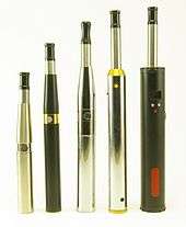 First-generation e-cigarettes tend to look like tobacco cigarettes and so are called "cigalikes".[10] The three parts of a cigalike e-cigarette initially were a cartridge, an atomizer, and a battery.[35] A cigalike e-cigarette currently contains a cartomizer (cartridge atomizer), which is connected to a battery.[35] Most cigalikes look like cigarettes but there is some variation in size.[35]